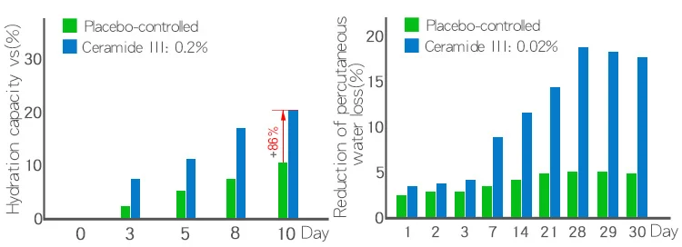 After 10 days, the water holding capacity of the skin with the application of ceramide was improved by 86% compared with that in the Placebo-controlled.