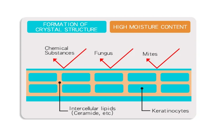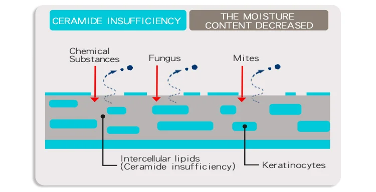 Ceramide is an important natural lipid component present in human skin, where it constitutes 40% of the total in the stratum corneum.Ceramide, which holds skin keratinocytes tightly together, can effectively lock skin moisture and block harmful substances from entering the skin.The ceramide content in damaged skin is lower, and the skin's ability to lock water decreases, making it more sensitive to external stimuli.Seasonal variations and other irritants can dry the skin, cause allergies, and even cause allergic dermatitis.At the same time, ceramide can also reduce